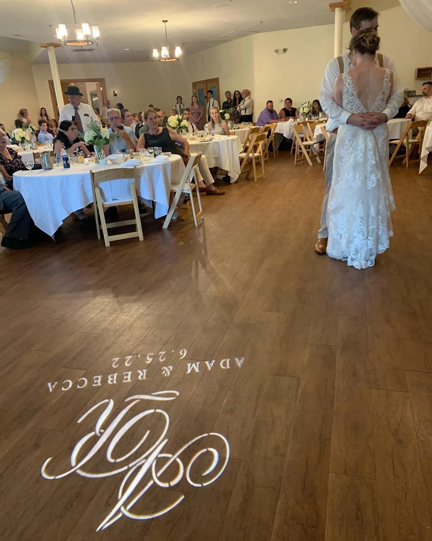 You can personalize your special event by projecting your name, your initials, your special date, or even a special design onto the dance floor or wall of your party. Create a focal point for your guests on the dance floor or wall. Make your first dance unique, or create that one-of-a-kind photo spot for your guests!